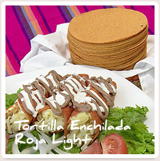 Tortilla de maíz que ya tiene integrados los ingredientes para preparar sabrosas enchiladas rojas con bajo contenido calórico. El peso de cada tortilla es de 20-22 gramos.